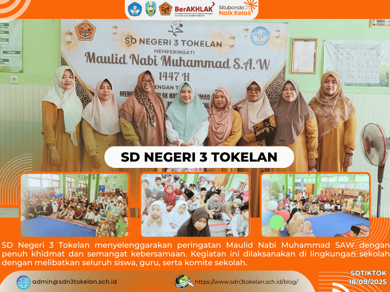 SD Negeri 3 Tokelan menyelenggarakan peringatan Maulid Nabi Muhammad SAW dengan penuh khidmat dan semangat kebersamaan. Kegiatan ini dilaksanakan di lingkungan sekolah dengan melibatkan seluruh siswa, guru, serta komite sekolah.