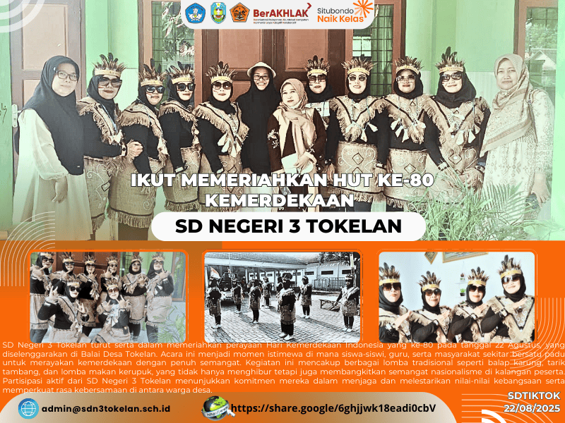 SD Negeri 3 Tokelan turut serta dalam memeriahkan perayaan Hari Kemerdekaan Indonesia yang ke-80 pada tanggal 22 Agustus, yang diselenggarakan di Balai Desa Tokelan. Acara ini menjadi momen istimewa di mana siswa-siswi, guru, serta masyarakat sekitar bersatu padu untuk merayakan kemerdekaan dengan penuh semangat. Kegiatan ini mencakup berbagai lomba tradisional seperti balap karung, tarik tambang, dan lomba makan kerupuk, yang tidak hanya menghibur tetapi juga membangkitkan semangat nasionalisme di kalangan peserta. Partisipasi aktif dari SD Negeri 3 Tokelan menunjukkan komitmen mereka dalam menjaga dan melestarikan nilai-nilai kebangsaan serta memperkuat rasa kebersamaan di antara warga desa.