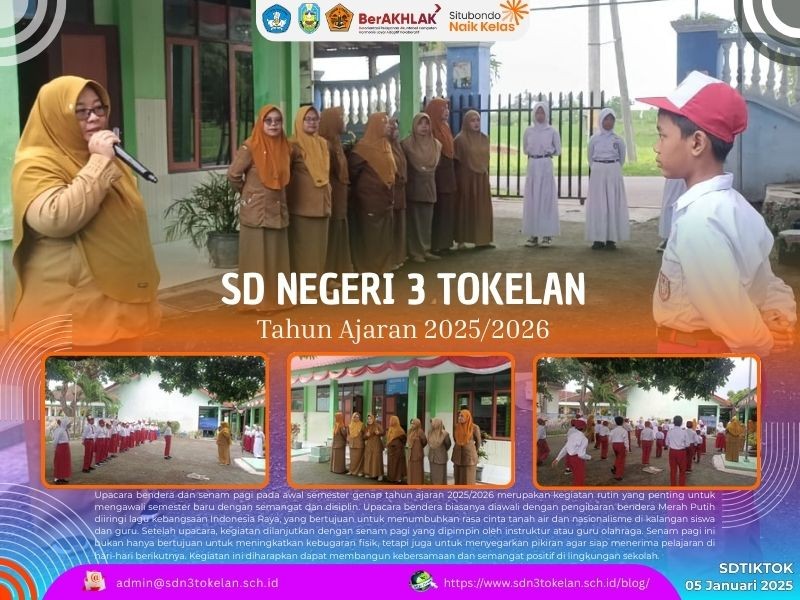 SD Negeri 3 Tokelan melaksanakan upacara bendera dan senam pagi pada awal semester genap pada tanggal 05 Januari tahun pelajaran 2025/2026 merupakan kegiatan rutin yang penting untuk mengawali semester baru dengan semangat dan disiplin. Upacara bendera biasanya diawali dengan pengibaran bendera Merah Putih diiringi lagu kebangsaan Indonesia Raya, yang bertujuan untuk menumbuhkan rasa cinta tanah air dan nasionalisme di kalangan siswa dan guru. Setelah upacara, kegiatan dilanjutkan dengan senam pagi yang dipimpin oleh instruktur atau guru olahraga. Senam pagi ini bukan hanya bertujuan untuk meningkatkan kebugaran fisik, tetapi juga untuk menyegarkan pikiran agar siap menerima pelajaran di hari-hari berikutnya. Kegiatan ini diharapkan dapat membangun kebersamaan dan semangat positif di lingkungan sekolah.